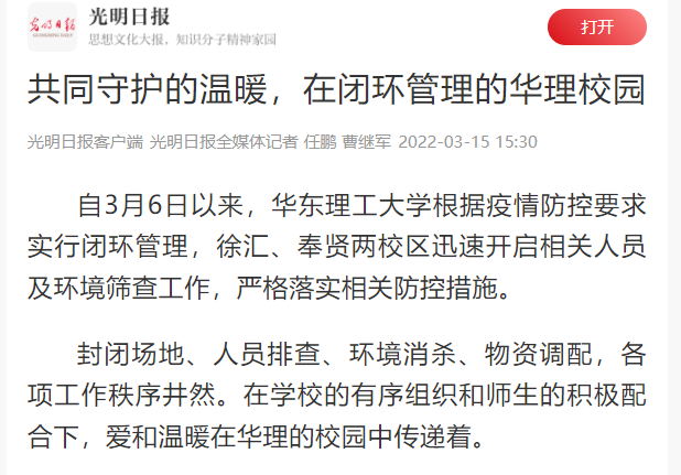 自3月6日以来,华东理工大学根据疫情防控要求实行闭环管理,徐汇、奉贤两校区迅速开启相关人员及环境筛查工作,严格落实相关防控措施。