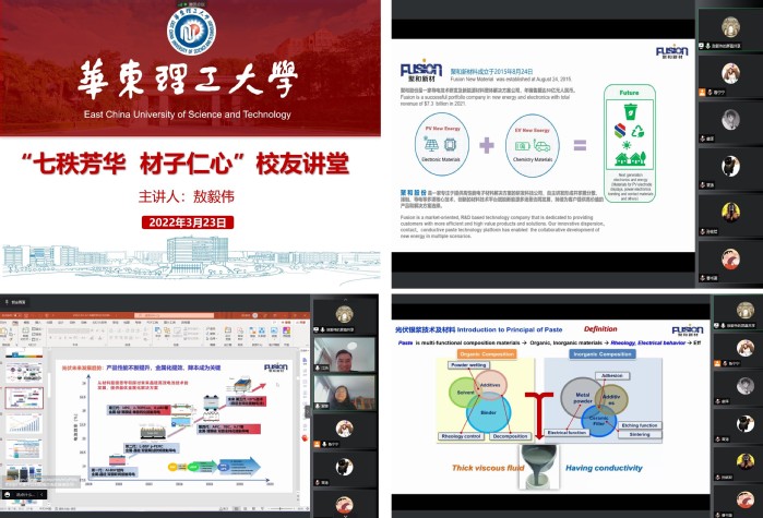 2022年是华理建校70周年,材料学院开展“七秩芳华 材子仁心”校友讲堂,凝聚校友力量,同心战“疫”。3月23日下午,常州聚和新材料股份有限公司(以下简称“聚和股份”)董事、研发副总敖毅伟受邀作“功能材料在光伏新能源及电子行业的应用”线上主题报告。260余名师生在线上积极参加,活动由材料学院教授江浩主持。
