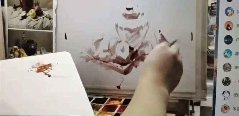 疫情之下,华东理工大学艺术设计与传媒学院金一老师将“基础绘画色彩”课程转到线上,把家里变成画室,“手把手”地教美术。与清一色的电脑投屏不同,她的电脑画面正中,摆放着的是一幅还未完工的水粉画作。而在屏幕的另外一边,40多名零基础的大一同学正在安静地学习作画。