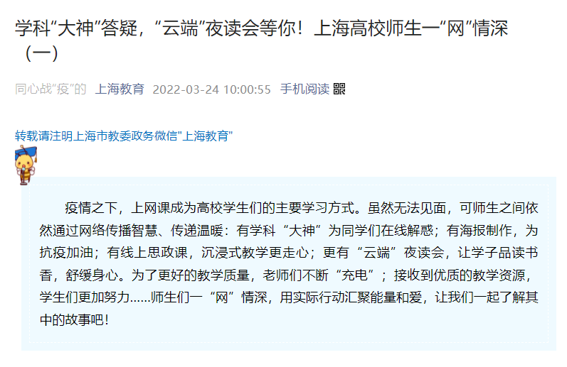 疫情之下,上网课成为高校学生们的主要学习方式。虽然无法见面,可师生之间依然通过网络传播智慧、传递温暖:有学科“大神”为同学们在线解惑;有海报制作,为抗疫加油;有线上思政课,沉浸式教学更走心;更有“云端”夜读会,让学子品读书香,舒缓身心。为了更好的教学质量,老师们不断“充电”;接收到优质的教学资源,学生们更加努力……师生们一“网”情深,用实际行动汇聚能量和爱,让我们一起了解其中的故事吧!