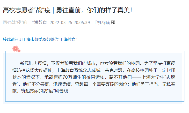 新冠肺炎疫情,不仅考验着我们的城市,也考验着我们的校园。为了坚决打赢疫情防控这场大仗硬仗,上海教育系统众志成城、共克时艰。在高校校园处于一定封闭状态的情况下,承载着约70万师生的校园运转,离不开他们——上海大学生“志愿者”,他们不分昼夜,迅速集结,奔赴每一个需要支援的岗位;他们勇于担当,无私奉献,筑起亮丽的战“疫”风景线!