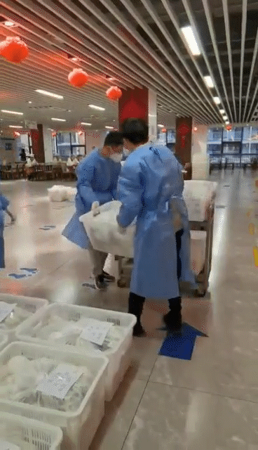 在“倒春寒”之下,上海最近总是阴雨阵阵,这给志愿者的工作增添了不少的负担,高材182班的周煜回忆道:“那两天雨很大,志愿者都需要在隔离衣、口罩、手套的基础上额外穿上雨鞋、雨披,整个人行动很闷很热,同时也笨重了很多,且为了保证盒饭不被雨淋湿,还要在盒饭上再盖一层防潮垫,盒饭箱的重量也大大增加。”面对工作量的大大增加,周煜和他周围的志愿者并没有抱怨,虽然大汗淋漓,但心里装着等待的同学们,工作起来更有劲头。