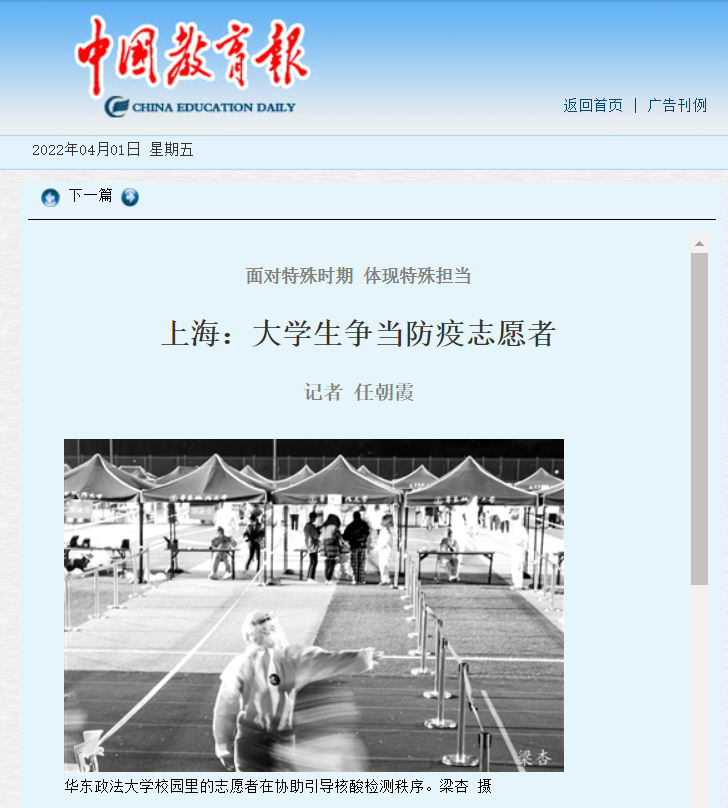 华东政法大学研二学生李嘉兴和学校国防教育协会的成员一起做起了维持核酸检测秩序的志愿者。“当得知学校封闭管理的消息时,我们的第一反应就是——我们能帮上什么忙。得知任务安排后,大家都积极投入其中,希望能够尽好自己的责任。”李嘉兴表示,“身处第一线,我更能感受到大家共克时艰的力量。”