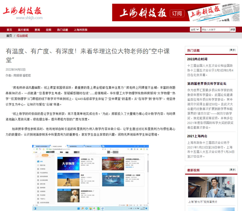 “房老师讲话风趣幽默,线上课堂氛围很活跃,最重要的是上课全程都在集中注意力”“房老师上网课毫不含糊,丰富的例题串联知识点,一点就通”“总是替学生考虑,答疑解惑随时在线”……疫情期间,华东理工大学物理学院教师房毅将“大学物理”“热学”“欣赏物理学”3门课程的线下教学环节转到线上,让449名修读学生体验了“空中课堂”的温度。从“在场学”到“参与学”,他坚持以学生为中心,让知识与爱在“云端”传递。