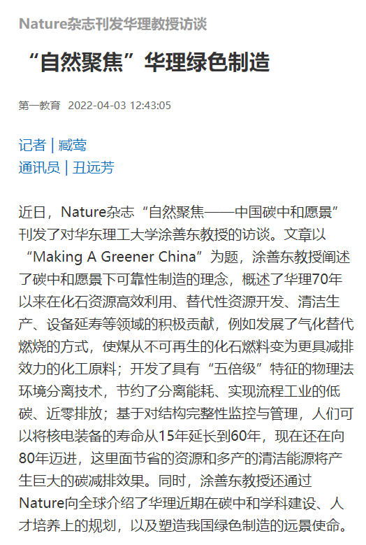 近日,Nature杂志“自然聚焦——中国碳中和愿景”刊发了对华东理工大学涂善东教授的访谈。文章以“Making A Greener China”为题,涂善东教授阐述了碳中和愿景下可靠性制造的理念,概述了华理70年以来在化石资源高效利用、替代性资源开发、清洁生产、设备延寿等领域的积极贡献,例如发展了气化替代燃烧的方式,使煤从不可再生的化石燃料变为更具减排效力的化工原料;开发了具有“五倍级”特征的物理法环境分离技术,节约了分离能耗、实现流程工业的低碳、近零排放;基于对结构完整性监控与管理,人们可以将核电装备的寿命从15年延长到60年,现在还在向80年迈进,这里面节省的资源和多产的清洁能源将产生巨大的碳减排效果。同时,涂善东教授还通过Nature向全球介绍了华理近期在碳中和学科建设、人才培养上的规划,以及塑造我国绿色制造的远景使命。