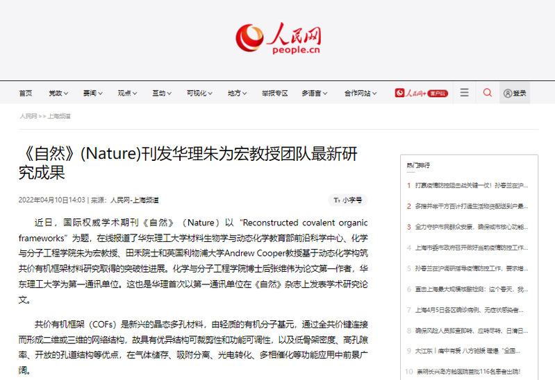 近日,国际权威学术期刊《自然》(Nature)以“Reconstructed covalent organic frameworks”为题,在线报道了华东理工大学材料生物学与动态化学教育部前沿科学中心、化学与分子工程学院朱为宏教授、田禾院士和英国利物浦大学Andrew Cooper教授基于动态化学构筑共价有机框架材料研究取得的突破性进展。化学与分子工程学院博士后张维伟为论文第一作者,华东理工大学为第一通讯单位。这也是华理首次以第一通讯单位在《自然》杂志上发表学术研究论文。