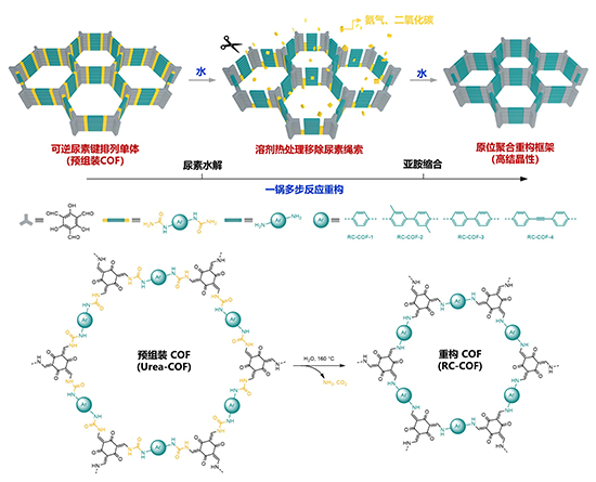 借鉴了超分子化学纳米限域反应和动态共价化学的理念,研究团队巧妙地将框架共价组装和不可逆共价键分开,提出了“重构共价有机框架”的合成策略:利用可逆共价键,将有机基元“预组装”成晶态框架,再进行合成后的“限域重构”,由此实现高稳定性结晶COF在常规合成条件下的高效制备和可规模化生产。