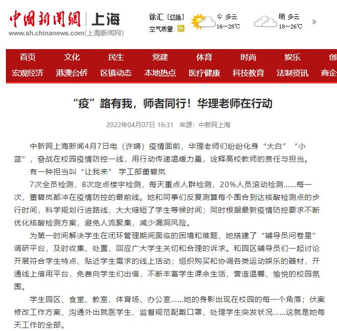 作为学院团委老师,她积极牵头,组织开展“分享抗疫生活小确幸”“线上学习打卡”“‘即使歌声无形’线上歌会”等特色活动,推出“平凡天使”视频,引导学院学生积极抗疫,向所有奋斗在抗疫一线的工作人员致敬。疫情当前,每个人都是一束微光,感谢陪着华理、陪着上海走完这段艰难抗疫路的每个人!