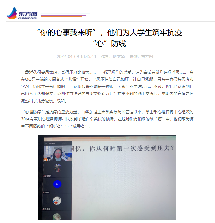 “心理防疫”是抗疫的重要力量。自华东理工大学实行闭环管理以来,学工部心理咨询中心组织的30名专兼职心理咨询师团队收到了近百个类似的倾诉,在这场没有硝烟的战“疫”中,他们成为师生不同情绪的“倾听者”与“疏导者”。
