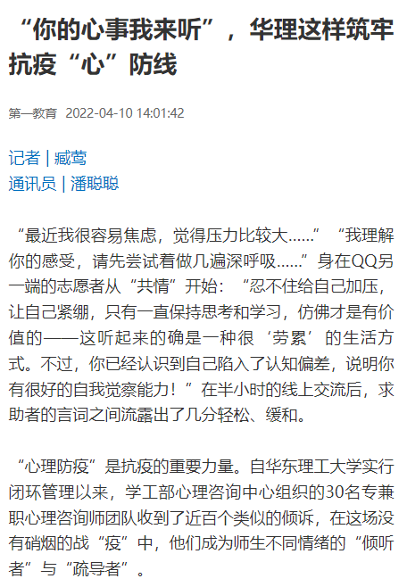 “心理防疫”是抗疫的重要力量。自华东理工大学实行闭环管理以来,学工部心理咨询中心组织的30名专兼职心理咨询师团队收到了近百个类似的倾诉,在这场没有硝烟的战“疫”中,他们成为师生不同情绪的“倾听者”与“疏导者”。