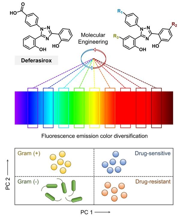 随着抗生素的滥用,临床多重耐药菌(超级细菌)的出现严重危害了住院病人和老龄人口的生命健康。因此,对于超级细菌便捷、快速的探测将有助于细菌感染的早期诊断和精准治疗。针对传统微生物检测技术操作繁复、耗时长、对仪器设备要求高等缺陷,研究团队发展了一种新型简易的多色荧光传感阵列,实现了细菌的高效识别与区分。前期研究工作中,贺晓鹏教授团队与美国德克萨斯大学奥斯汀分校乔纳森•塞斯勒教授团队合作,对FDA批准的一种铁螯合剂药物Deferasirox (ExJade)进行结构改性,合成了具有荧光性质的ExJade衍生物,并初步验证了其在细菌生物被膜荧光可视化中的应用。