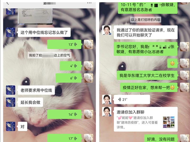 体育学院研究生施羽自疫情暴发之初就主动申请成为小区的一名志愿者,已参与了10余次小区的全员核酸检测工作。此外,给李大爷修机顶盒,给刘奶奶送药,给张奶奶买菜送菜,扶老人到核酸检测点,把社区老人都拉进微信群……热心的施羽帮助社区老人解决了很多生活上的困难。