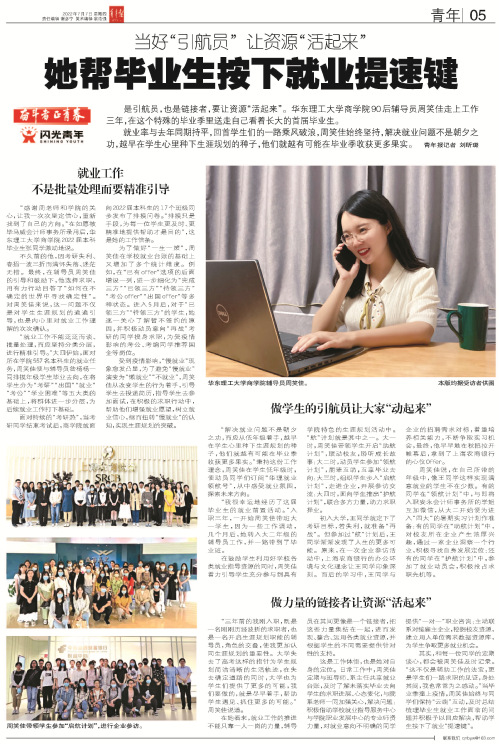 在她看来,就业工作的推进不能只靠一人一岗的力量,辅导员在其间更像是一个链接者,把这些力量集结在一起,进而发现、整合、运用各类就业资源,并根据学生的不同需要提供针对性的支持。