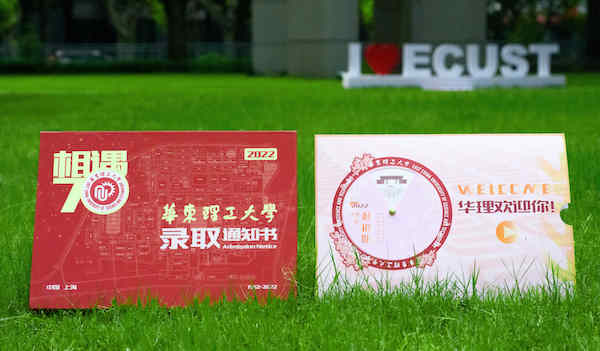 通知书正面印有正文,中间放大版的华理logo,呼应着底部的华理校门,无处不在的学校元素,期待着与学子们在美丽校园相见。背面印着敞开的华理正门,在洒金背景中显得格外威严气派,象征着学子们将在这里开启一段辉煌的征程。