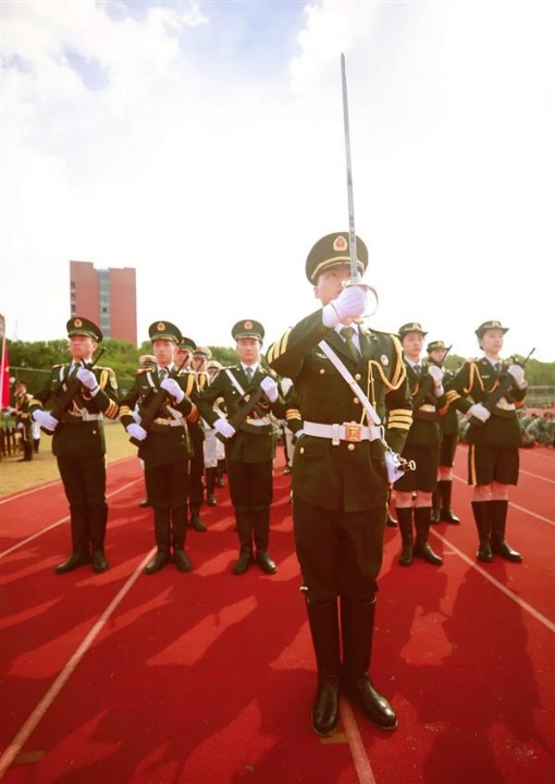 身着迷彩,动作标准,举手投足间满是“军人范”。在学校武装部的领导和支持下,于志豪取得了上海市国防教育中心颁发的军训资质证书,和其他退伍大学生一起,投身于校园国防教育相关工作。2020年的新生军训工作中,他凭借优异表现获评“优秀军训排长”,期间,于志豪加入国旗护卫队,在军训分列式的护旗方队中担任排头兵,身着飒爽的军礼服,以最挺拔的身姿接受检阅。