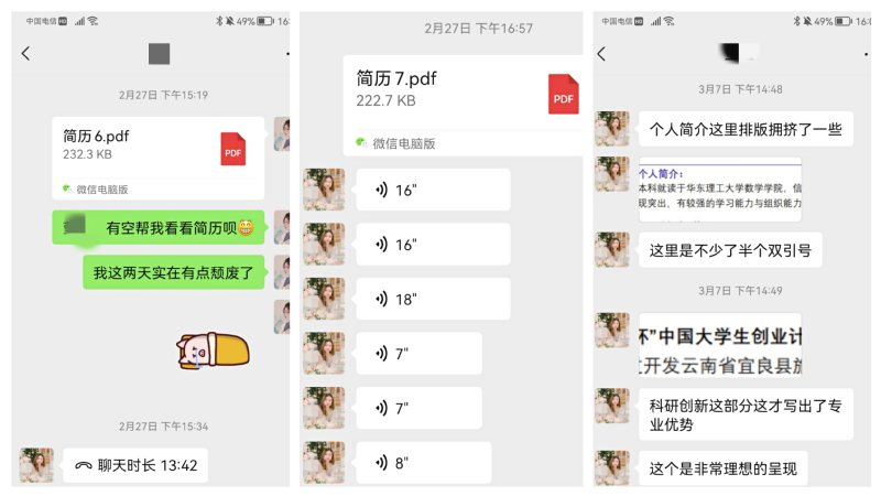 套用模板完成第一版简历之后,我发给了李莹老师,李老师第一时间打来了电话,开始非常细致地指导我修改、优化。简历中列出的每一点、每一段的排版,甚至连字体颜色、大小等,她都帮我一点一点地改正并解释原因。后续大概又修改了六七次,每次她都是发来一大段接一大段的语音,或者占满整个聊天界面的文字。当最终版本的简历呈现在面前时,我突然有了“一脚踏空又平稳落地”的安心感,也正是从这个时候开始,我才真正开始了求职之旅。