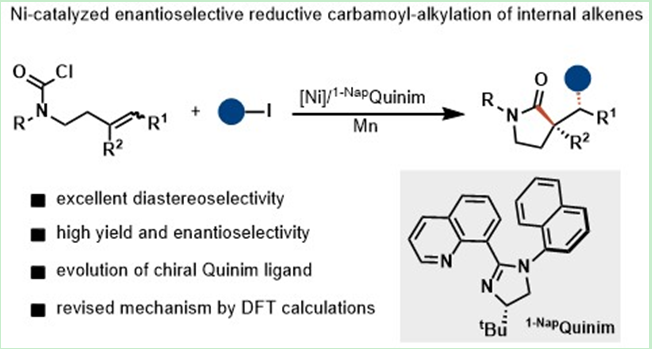 过渡金属催化的胺甲酰基亲电试剂的对映选择性环合反应作为手性内酰胺合成的重要方法之一,近年来,该方法得到了化学家们的广泛关注。陈宜峰教授课题组基于对过渡金属催化的烯烃不对称双官能团化反应构建多重手性中心的研究兴趣,通过对课题组发展的手性8-喹啉咪唑啉为核心骨架Quinim配体的进一步优化,实现了镍催化的内烯不对称胺甲酰基-烷基化反应,为含连续手性中心的γ-内酰胺的便捷式合成提供了一类全新、温和高效的方法。此外,课题组还与加州大学洛杉矶分校 (UCLA)的K. N. Houk课题组合作,对Quinim配体在对映选择性的决定步骤中的作用及反应机理进行了DFT理论计算。理论计算为镍催化还原偶联化学的反应机制以及Quinim手性配体的进一步设计开发提供了理论指导。