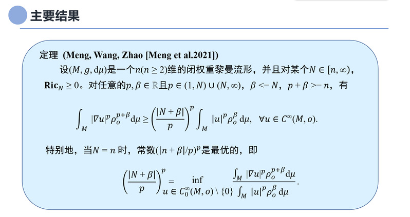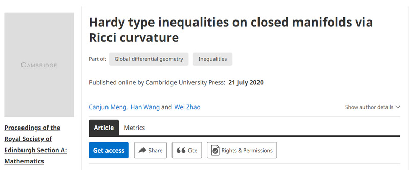 同心山成玉,协力土变金。最终,孟灿君以第一作者身份发表了一篇题为“闭流形上基于Ricci曲率的Hardy不等式”的论文,收录在剑桥大学出版的Proceedings of the Royal Society of Edinburgh Section-A中。在该研究中,孟灿君与团队成员用Ricci曲率在闭流形上建立了Hardy不等式,突破了目前Hardy不等式只能在非紧流形上建立的限制。这对研究椭圆、抛物及热方程的解有着很重要的推进作用,这些方程已被应用于各类飞行器的优化设计中。