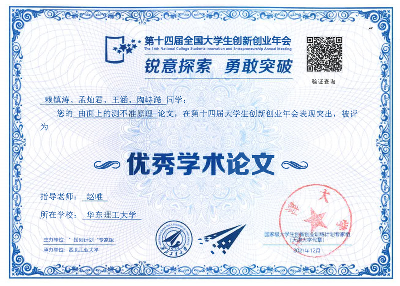 一直以来,孟灿君都被广义相对论与黎曼几何之间的联系所震撼,当看到“曲面上的测不准原理”选题时,便毫不犹豫地联合两位搭档赖镇涛、王涵加入了该“大创”项目。也正是通过这次经历,她敲开了基础学科科研的大门,初展科研羽翼。