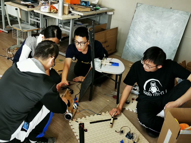在开展“智能餐桌清理机器人”项目研究的过程中,团队同样遇到了不少困难。“最大的障碍就是不知道问题出在哪里,我们经常调侃说是‘玄学’。”比如,在机器人伸缩结构的制作上,材料都已准备就绪,但装配之后,导轨和滑块的运动远没有设想得那么流畅,原先以为只需要拧拧螺丝、搭搭积木就行的问题,耗费了他们大量的时间和脑力。后来,团队分析出原因可能是底部亚克力板在固定后有形变,导致上面安装的两根导轨间平行度不达标,经过多次的试验与优化后,最终解决了这个问题。这些失败与尝试的经历,锻炼了他们自己发现、解决问题的能力,给了他们继续前行的动力。