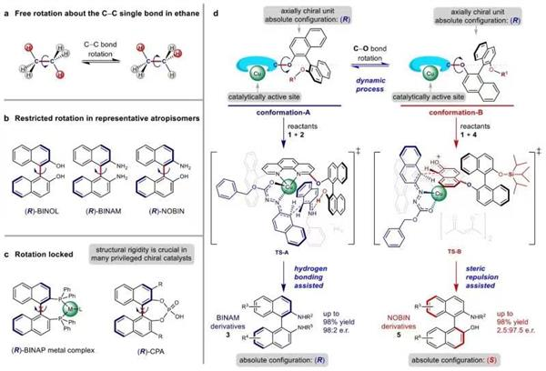 由单键的自由旋转导致的分子动态构象对分子功能和化学转化起着至关重要的作用,例如,在酶催化中分子的构象就是一个影响催化活性和选择性的关键因素。然而在不对称催化中,非酶催化剂(包括过渡金属催化剂和有机小分子催化剂,例如BINAP金属络合物和手性磷酸催化剂)的结构刚性,通常被认为是实现高手性诱导的一个必不可少的因素,关于手性催化剂分子的柔性和动态构象对手性诱导影响的研究却非常少。因为直接分离不同构象具有极大的难度,所以揭示手性催化剂分子的动态构象与对映识别之间的关系也就非常具有挑战性。