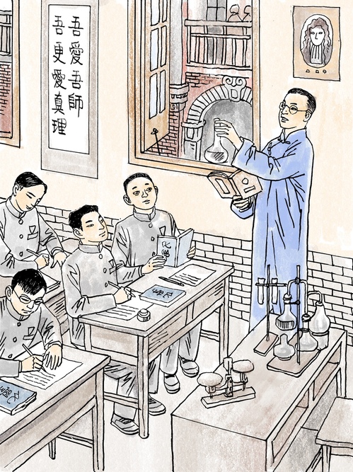 首幅连环画就画出张江树与化学的一生缘起:辛亥革命爆发前夕,12岁的张江树离开家乡,只身前往上海苏松太道立山龙门师范学校(上海中学前身)求学。4年后,他以优异成绩考取南京高等师范学校(南京大学前身),系统学习先进的科学文化知识。读书期间,他勤勉用功、善于钻研,化学成绩突出。1918年毕业,留任学校化学课程助教——20岁的张江树从此与化学和教育结下了终生之缘。