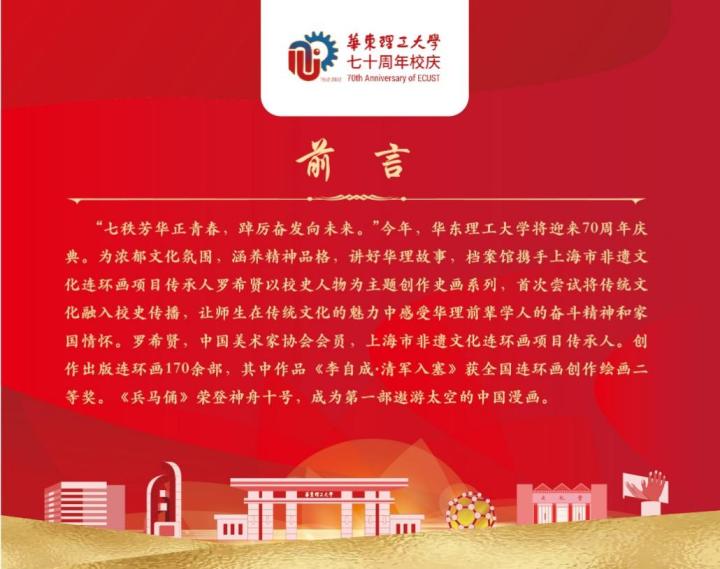 “非遗+校史”既是一次推动校园文化的美育教育,又是弘扬传统文化的创新尝试。2021年,华理档案馆在广泛调研的基础上,经专家推荐和深入走访,选择了上海市非遗文化连环画项目传承人罗希贤团队,并以校史人物为主题开展史画系列的创作实践。罗希贤是中国美术家协会会员,先后创作出版连环画170余部,其中作品《李自成·清军入塞》获全国连环画创作绘画二等奖。《兵马俑》荣登神舟十号,成为第一部遨游太空的中国漫画。