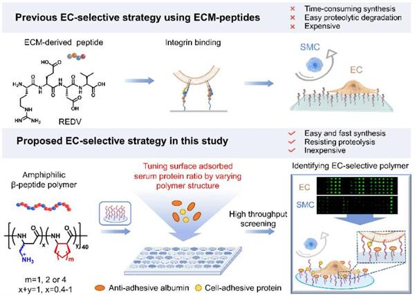 刘润辉教授课题组设计合成了一系列具有阳离子和疏水性亚基可调的两亲性β-多肽聚合物,通过调节蛋白在聚合物修饰表面的吸附实现了对内皮细胞的选择性黏附。此外,β-多肽聚合物通过一锅法聚合制备,具有优异的抗蛋白酶水解能力和稳定性,相对于多肽具有价格低廉且易于大批量合成等优点,能够针对性地有效克服ECM多肽的关键缺点,对血管内皮化研究和相关应用具有重要意义。