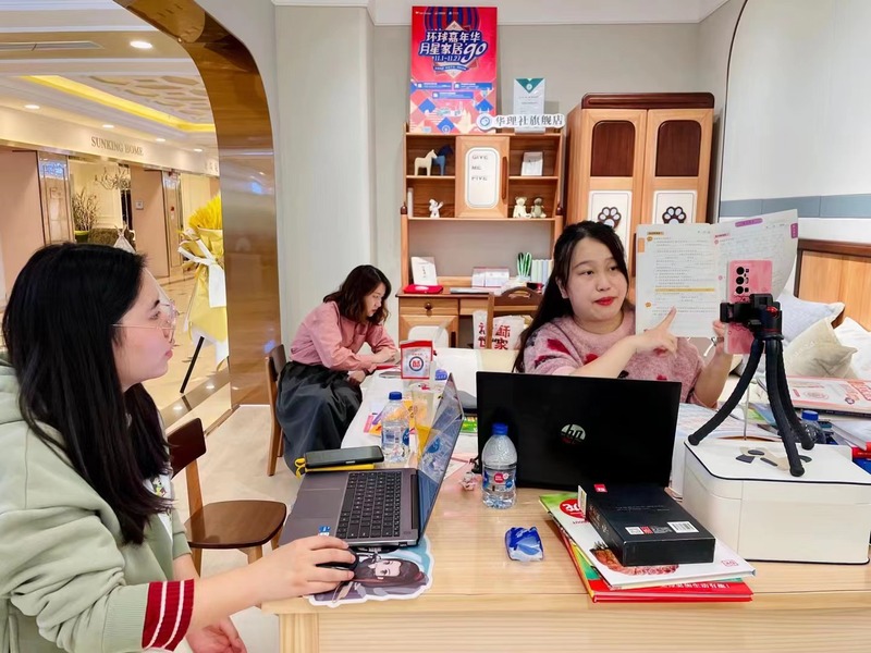 8场直播分散在月星家居门店1-5楼的展厅之中,各有特色。在3楼一家青少年家具品牌店中,华东理工大学出版社将直播间搭在了一间儿童房里。书桌成了主播“花梨妈妈”的直播台,背景是小朋友房间中的常见陈设:床、衣柜、书桌、书架。