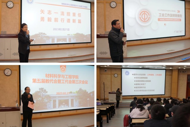 会上,第五届“双代会”代表们审议并通过了2022年材料学院行政工作报告、财务报告和工会工作报告、财务报告。