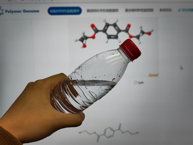 AI plus高分子软件平台显示饮用水瓶身材料PET的三维分子结构。徐瑞哲 摄