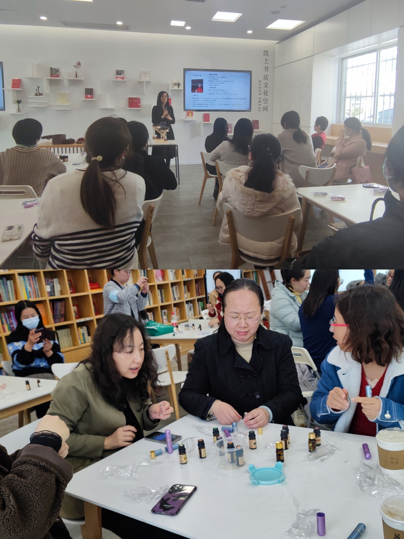 3月7日,在芳疗师、上海交通大学吴亚妮的指导下,女教师们现场体验了精油配方。取上2至3滴精油,用温热的掌心预热,慢慢闭上双眼,放到鼻边认真吸嗅,芳香分子传递到大脑千叶嗅觉区让人舒压放松,仿佛心灵得到了安抚。随后,女教师们还用闻香管调香,有的调配了提神醒脑的“大脑SPA”精油,有的尝试了呼吸系统的“金刚罩”精油,还有的教师调配了舒压安神的“好睡眠”精油。吴亚妮表示,通过精油按摩、冲浴和吸入等方式享受精油的芳香疗法,可以达到提升身体免疫力,排毒养颜等的功效。