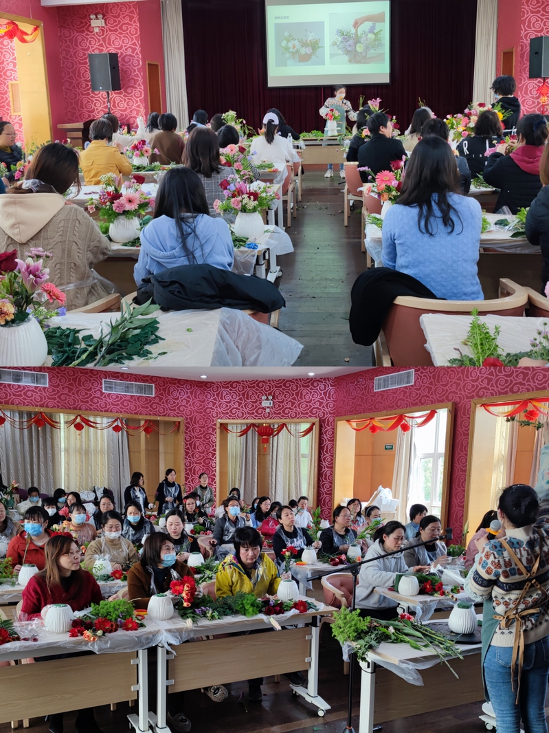 3月14日,插花活动火热开展。插花师以邻近色和同色系为配色要点,主打色彩鲜艳饱满的西洋式插花,表现出热情奔放、雍容华贵、端庄大方的风格特色,让女教师们叹为观止。同时,插花师现场传授了插花技巧,一步步带领女教师创作属于自己的花艺作品。在花的世界中,女教师们释放自己的情感,将自己的热爱投入到花艺中,感受到了美的力量。