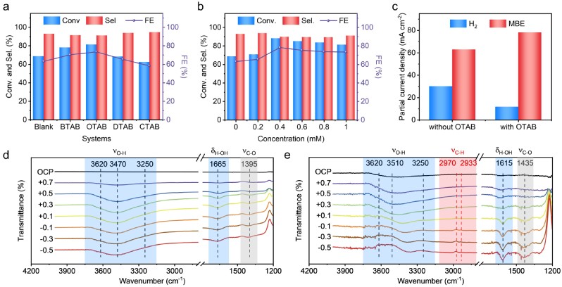 在电催化炔醇半加氢反应中,该工作创新性地构建了一个掺杂剂以及表面活性剂共调节的电极-电解液界面,通过性能研究、原位红外光谱表征以及理论计算相结合的方法,阐明了炔醇电催化加氢过程中高活性和法拉第效率的来源。通过以硼掺杂的钯基催化剂作为模型催化剂,探究不同链长的季铵盐表面活性剂对于界面水的传质以及炔醇加氢反应的影响。性能研究表明,加入合适链长以及合适浓度的表面活性剂可以实现最大化的烯醇法拉第效率。原位光谱证明,随着电压负移,界面水的反向吸附峰表明孤立水的显著损失,而弯曲水的峰偏移表明发生了从强氢键水到弱氢键水的转变。在含有表面活性剂的界面上形成适当的疏水微环境,可以在一定程度上阻碍界面水的传质,从而抑制HER。分子动力学结果表明,通过阳离子表面活性剂在界面上的自组装,建立了一个促进炔醇传质,并适当地阻碍水传质的界面微环境。因此,在不降低烯醇选择性的情况下,明显促进了炔醇半氢化到烯醇的法拉第效率。该工作对于反应过程和反应机制的认识可以进一步延伸到其他有机物的电催化加氢反应中。