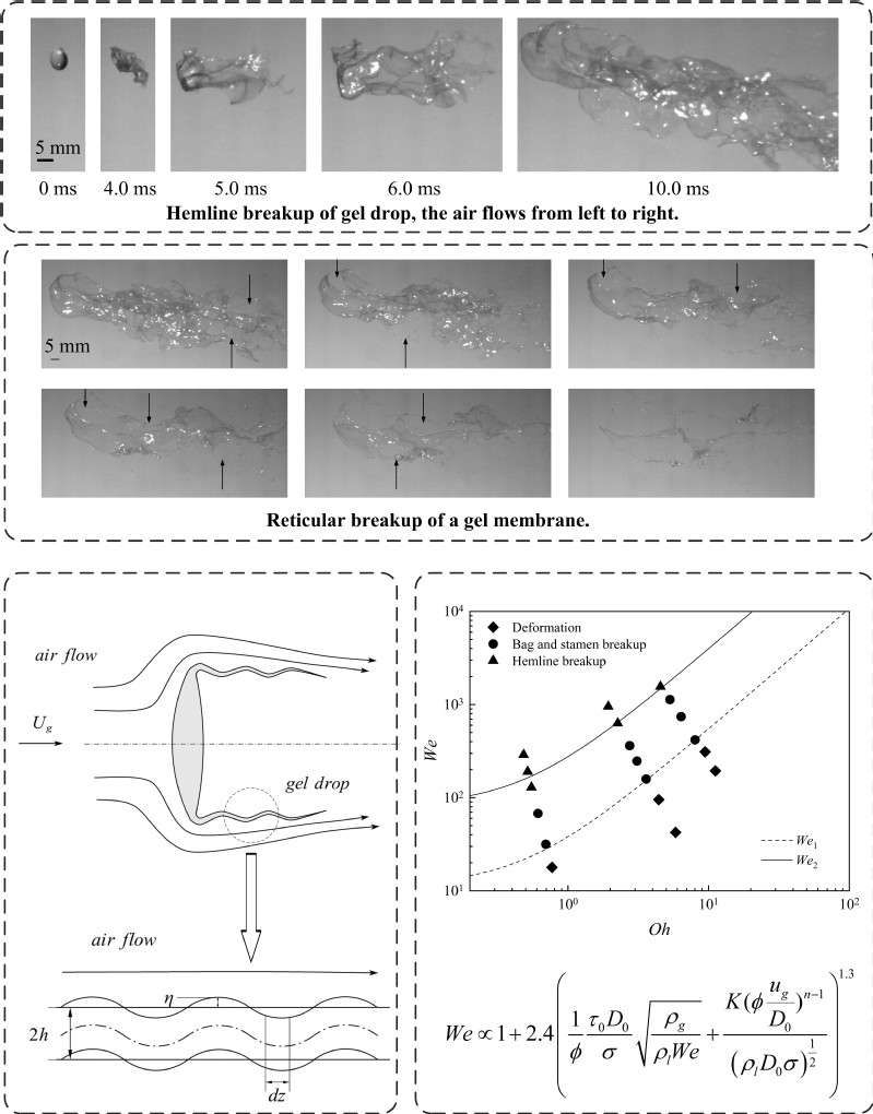 凝胶推进剂是航空、航天和武器等领域的新兴绿色燃料,兼具固体推进剂比冲大、易储存、安全性高和液体推进剂易调控、可重复点火等优点,成为各国竞相研究的重点之一。凝胶属于强屈服应力非牛顿复杂流体,雾化困难是目前亟待突破的瓶颈,所以凝胶雾化研究具有非常重要的应用价值,也是相关领域的前沿热点。作者研究发现了凝胶液滴裙摆状破裂新模式,并基于界面不稳定性理论分析揭示了其产生机理,获得了凝胶破裂的边界条件和变化规律,实现了凝胶雾化的精准调控,为凝胶推进剂喷注器的设计优化提供了理论依据。该成果得到了国家自然科学基金等项目的资助。