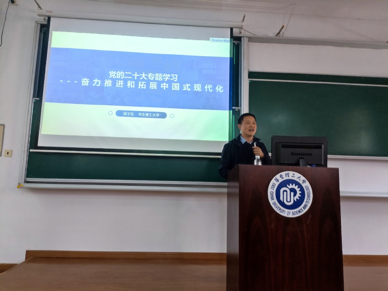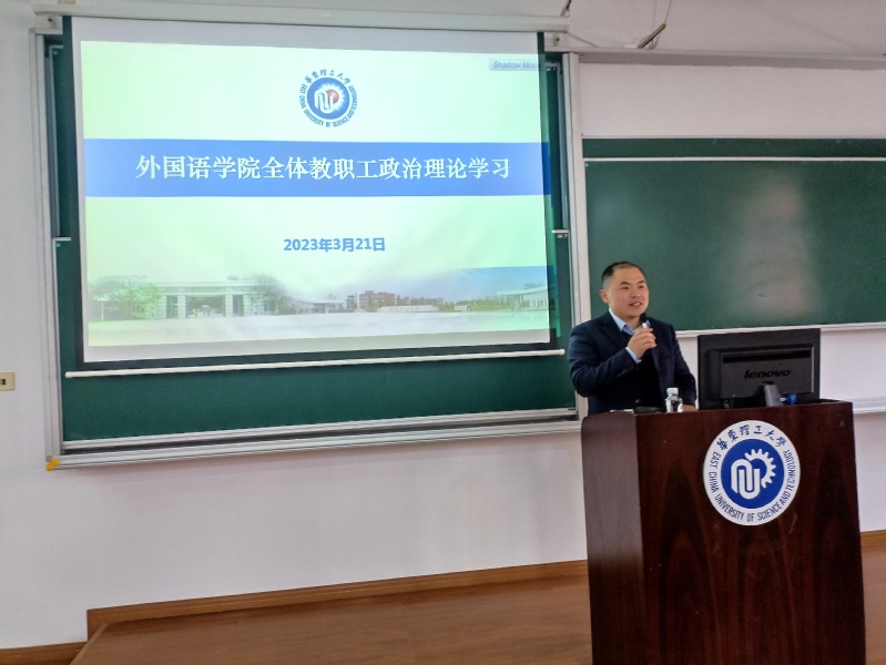 3月21日下午,外国语学院在三教201室组织全院教职工进行政治理论学习,特邀马克思主义学院副院长、博士生导师邱卫东教授作题为“党的二十大专题学习——奋力推进和拓展中国式现代化”的辅导报告。会议由学院党委副书记兼纪委书记裴文波主持。