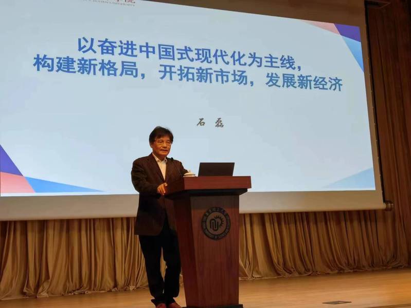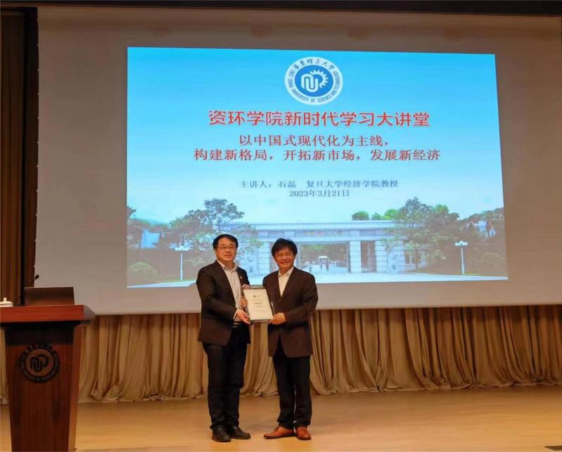3月21日下午,按照学院《关于学习宣传贯彻党的二十大精神的实施方案》,资环学院在商学院406会议室组织2023年首场“新时代学习大讲堂”报告会,特邀“市教卫工作党委系统学习贯彻党的二十大精神专家宣讲团”专家、复旦大学经济学院教授石磊为全院师生作“以奋进中国式现代化为主线,构建新格局,开拓新市场,发展新经济”主题报告。会议由学院党委副书记、纪委书记陈雪莉主持,学院党政领导、党委委员、教职工和学生党员参加了报告会。