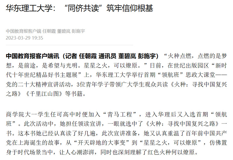 中国教育报客户端讯(记者 任朝霞 通讯员 董碧岚 彭施宇)“火种点燃,点燃的是梦想,是前途,是希望与光明。星星之火,可以燎原。”日前,在世纪出版园区“新时代十年世纪精品好书主题展”上,华东理工大学举行首期“领航班”思政大课堂——党的二十大精神宣讲活动,3位青年学子带领广大学生观众共读《火种:寻找中国复兴之路》《千里江山图》等书籍。