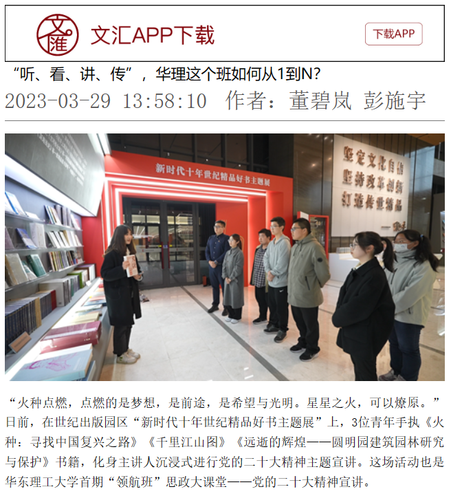 “火种点燃,点燃的是梦想,是前途,是希望与光明。星星之火,可以燎原。”日前,在世纪出版园区“新时代十年世纪精品好书主题展”上,3位青年手执《火种:寻找中国复兴之路》《千里江山图》《远逝的辉煌——圆明园建筑园林研究与保护》书籍,化身主讲人沉浸式进行党的二十大精神主题宣讲。这场活动也是华东理工大学首期“领航班”思政大课堂——党的二十大精神宣讲。