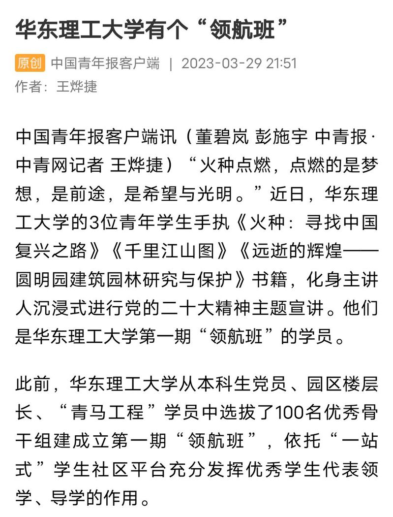 据悉,华东理工大学从本科生党员、园区楼层长、“青马工程”学员中选拔了100名优秀骨干组建成立第一期“领航班”,依托“一站式”学生社区平台充分发挥优秀学生代表领学、导学的作用。“领航班”学员积极发挥领学导学作用,当好“播音员”,在校内持续掀起学习宣传贯彻党的二十大精神热潮,以青春之声传递信仰力量。