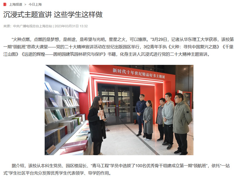 为深入学习宣传贯彻党的二十大精神,培养一批党的创新理论的传承者、宣传者和践行者,学校选拔了100名优秀骨干组建成立第一期“领航班”,依托“一站式”学生社区平台充分发挥优秀学生代表领学、导学的作用。近日,“领航班”学院在世纪出版园区“新时代十年世纪精品好书主题展”上沉浸式宣讲党的二十大精神,受到央视新闻网、新华网、中国青年报客户端、中国教育报客户端、中国新闻网、上观新闻、文汇APP、青春上海、上海科技报、第一教育等10余家媒体报道。