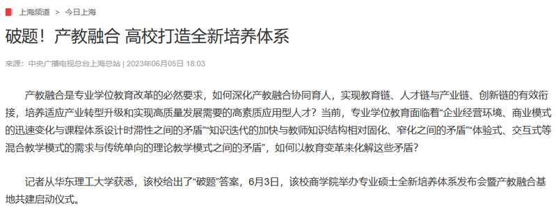 为适应新时代经济社会发展需要,不断完善高水平人才培养体系, 6月3日,商学院举办专业硕士全新培养体系发布会暨产教融合基地共建启动仪式。央视网、光明日报客户端、经济日报新闻客户端、中国教育新闻网客户端、文汇APP、中国证券网、新民周刊、中国新闻网、中化新网、东方网、新民网、第一教育、上海教育新闻网、上海科技报、话匣子等15家媒体进行了相关报道。