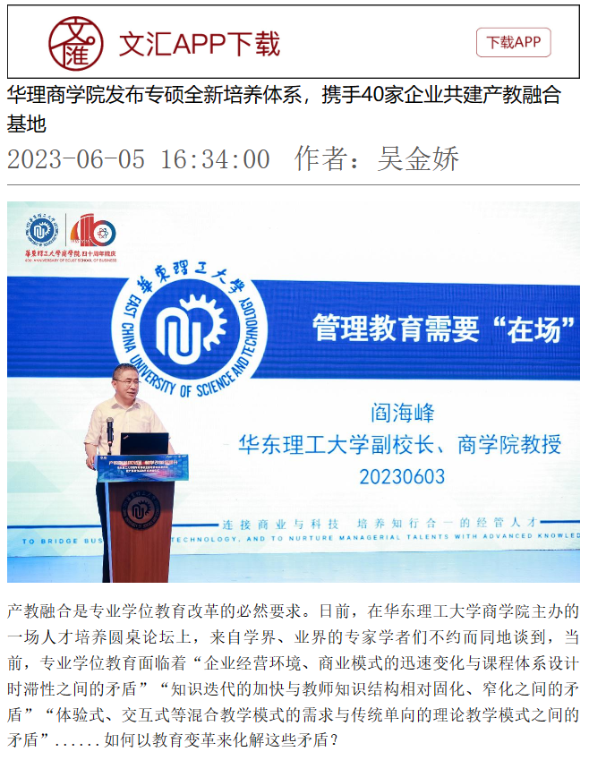 【文汇APP】华理商学院发布专硕全新培养体系,携手40家企业共建产教融合基地