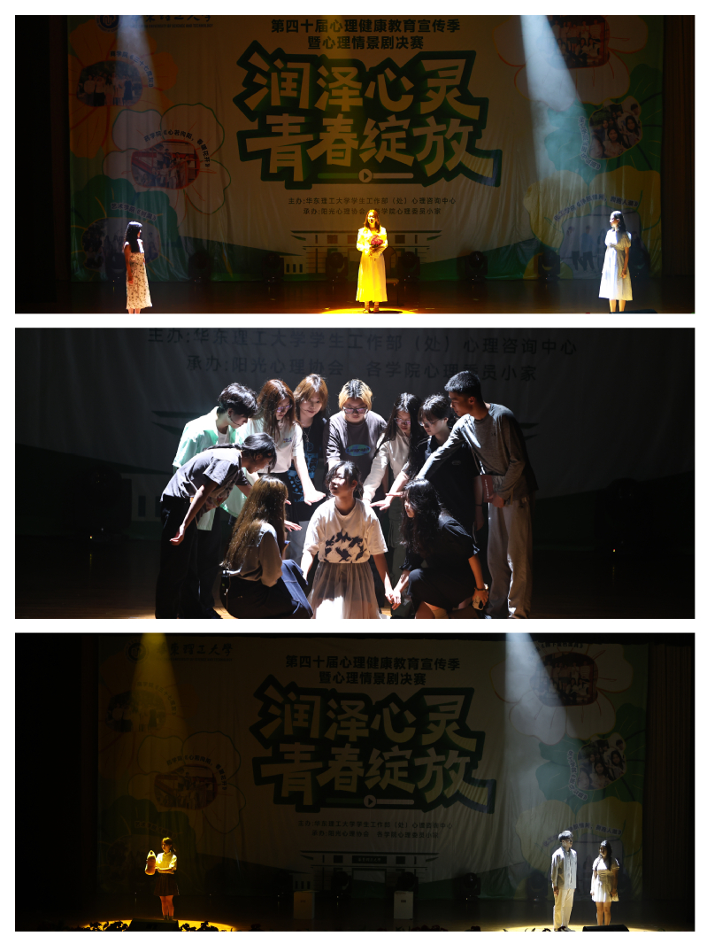 本次心理情景剧大赛各参赛作品从自我接纳、兴趣梦想、校园诈骗、虚荣消费、困境突破、心理关怀等方面,真实展现大学生活所面临的困难与冲突,诠释了当代大学生的内心世界与发展需求。心理情景剧作为我校心理健康教育的特色项目,已经连续举办多年,通过同学们自编、自导、自演的舞台剧形式,巧妙融入心理健康教育元素,在寓教于乐中启发学生深度思考,在表演与观看的同一时空,“看他人故事”促“自我成长”。