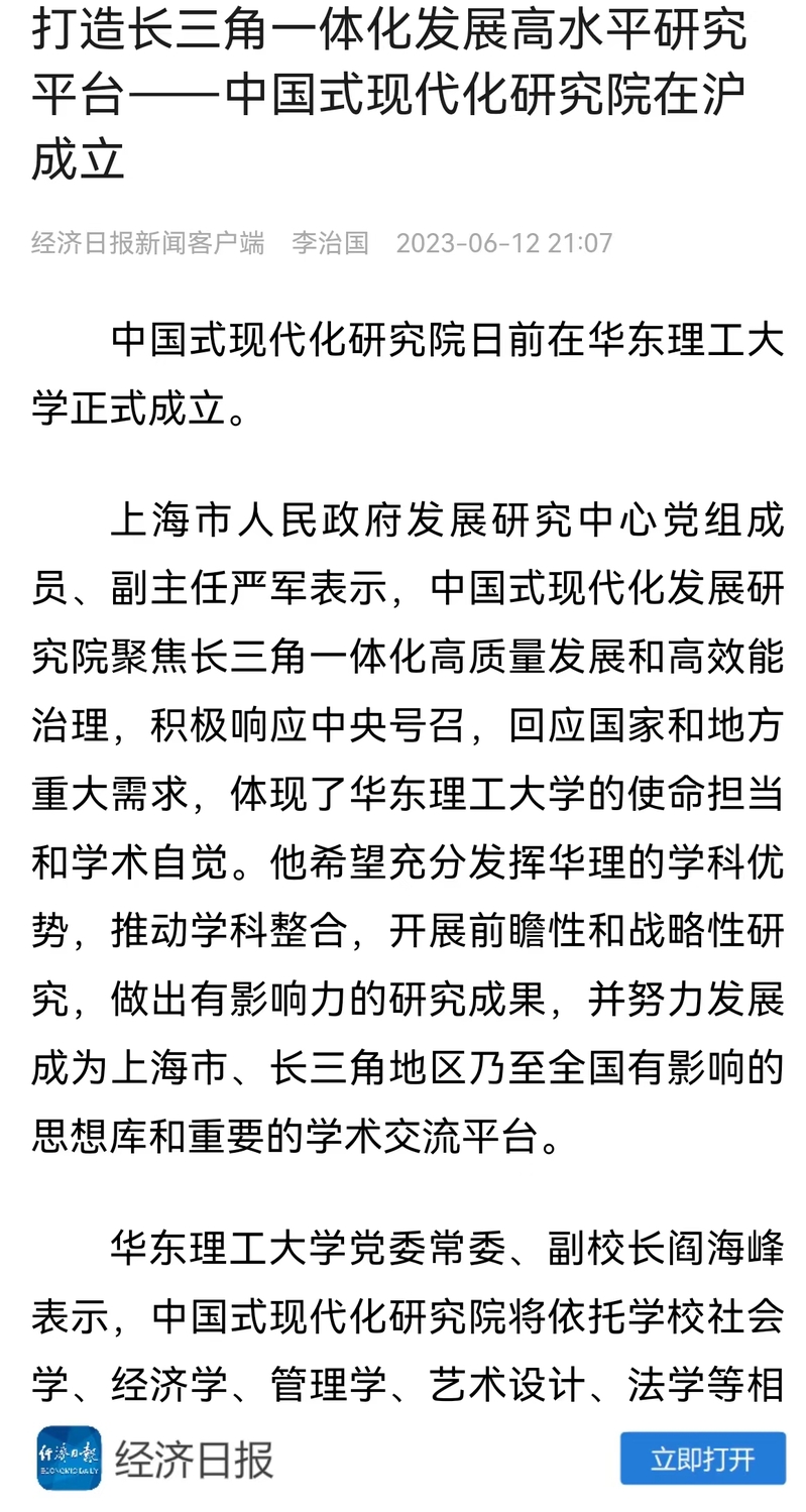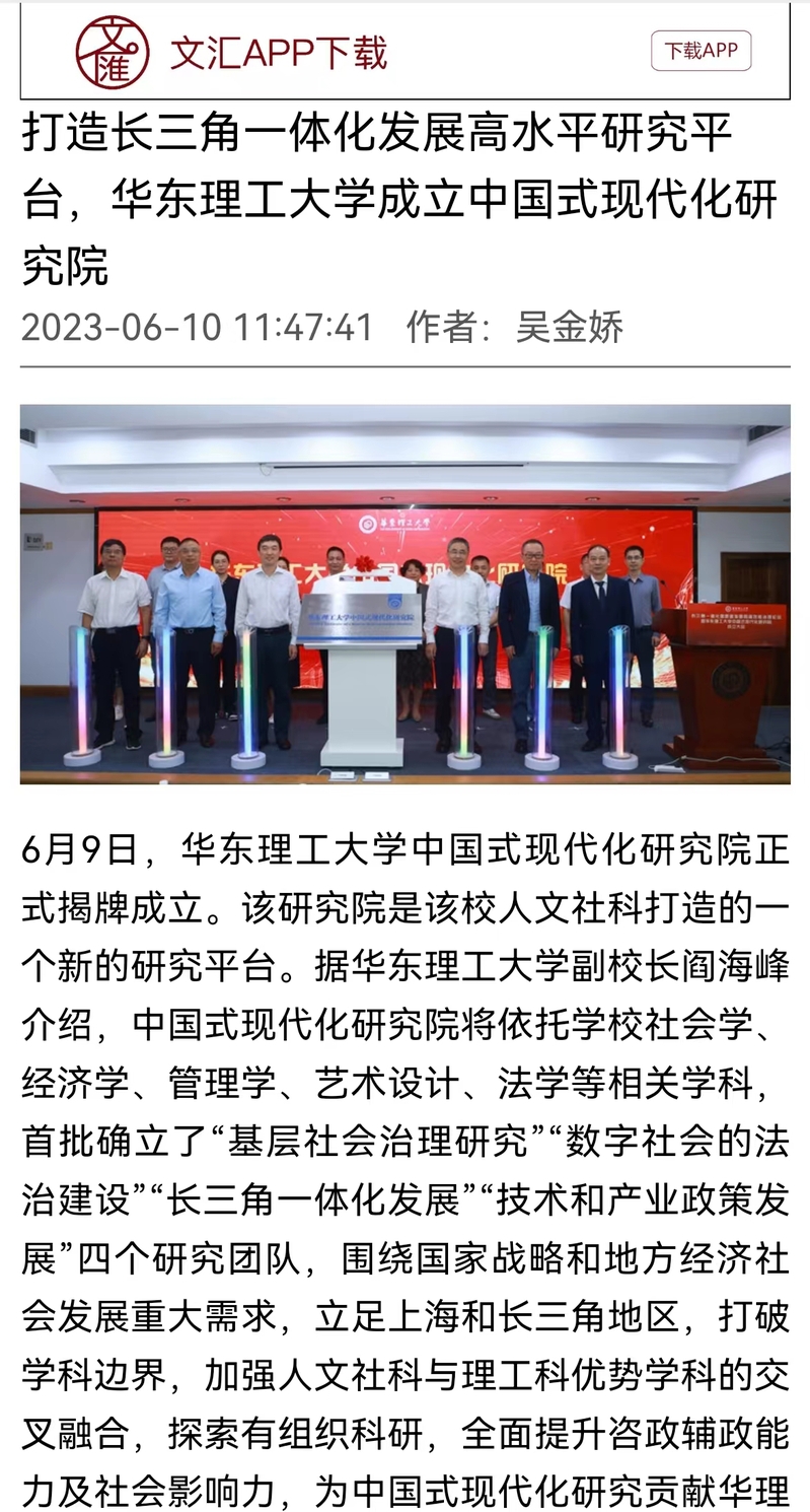 【文汇APP】打造长三角一体化发展高水平研究平台,华东理工大学成立中国式现代化研究院