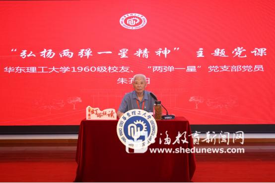 活动中,学生们观看了上钢新村街道“两弹一星”党支部的纪录片《初心》;朱孔阳为大家上了题为“弘扬‘两弹一星’精神”的沉浸式主题党课。朱孔阳讲述道,上世纪五六十年代,他在华东理工大学的前身华东化工学院第二无机系刻苦求学,毕业之后响应党和国家的号召,远赴青海基地投身军工研发的人生历程。