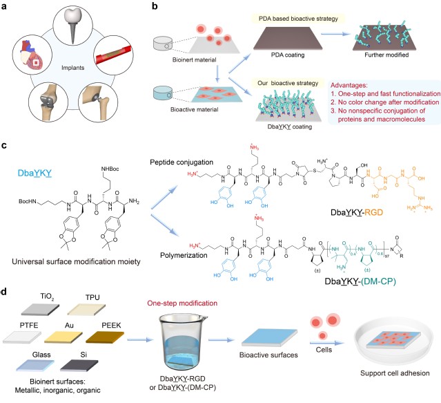 在此基础上,研究人员进一步设计合成了DbaYKY三肽端基的细胞黏附ECM多肽RGD和模拟ECM细胞黏附多肽DbaYKY-RGD的β-氨基酸聚合物DbaYKY-(DM-CP),发现这种简单通用修饰方法能够对不同生物材料基材(包括金属、无机和有机材料)进行修饰,仅5分钟即可赋予材料表面促进细胞黏附的功能,实现生物惰性表面向生物活性表面的转变。这一方法在组织工程修复材料和细胞芯片等生物材料领域具有广泛的应用。