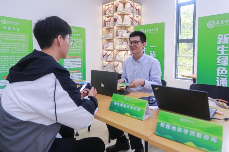 在华理校园内新修缮的慈善爱心屋里,有一个2023级新生“绿色通道”一站式受理点,可实现“一条龙”的资助服务,为新生办理生源地助学贷款回执录入、校园地助学贷款咨询等业务。