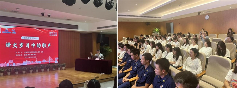 王勇教授以中国近现代历史为轴线,以“烽火岁月的歌声”为主题,通过一件件的历史事件把不同时期、不同阶段的音乐串联到一起,从学堂乐歌到北伐军歌、从《国际歌》传入到红军歌曲的传唱,重点讲述了九一八以来的抗日救亡歌咏运动中涌现出来的重要音乐作品。以史串歌、以歌叙史,清晰地展现了音乐在革命历史事件中的作用,在美妙的旋律中与党的历史对话,感悟中国共产党的光荣传统和伟大力量。讲座重点讲解了《义勇军进行曲》的历史价值及时代意义,进一步激发了新时代青年为中华民族伟大复兴而踔厉奋发、勇毅前行的磅礴之力。