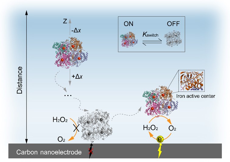 单个过氧化氢酶分子在碳纳米电极上电化学检测示意。华东理工供图
